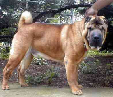 An alert, dignified, active, compact dog of medium size and substance, square in profile, close coupled, the well proportioned head slightly but not overly large for the body. The short, harsh coat, the loose skin covering the head and body, the small ears, the “hippopotamus” muzzle shape and the high set tail impart to the Shar-Pei a unique look peculiar to him alone. The loose skin and wrinkles covering the head, neck and body are superabundant in Chinese shar-Pei puppies but these features may be limited to the head, neck and withers in the adult.